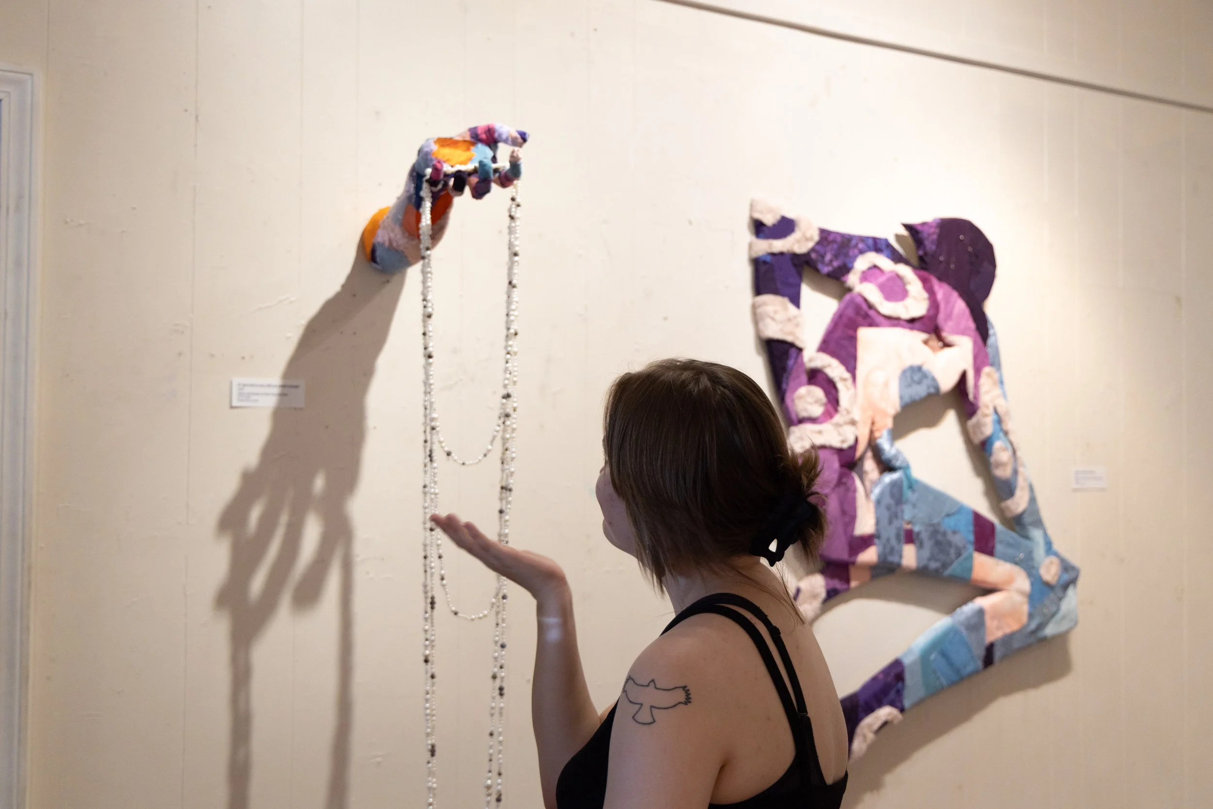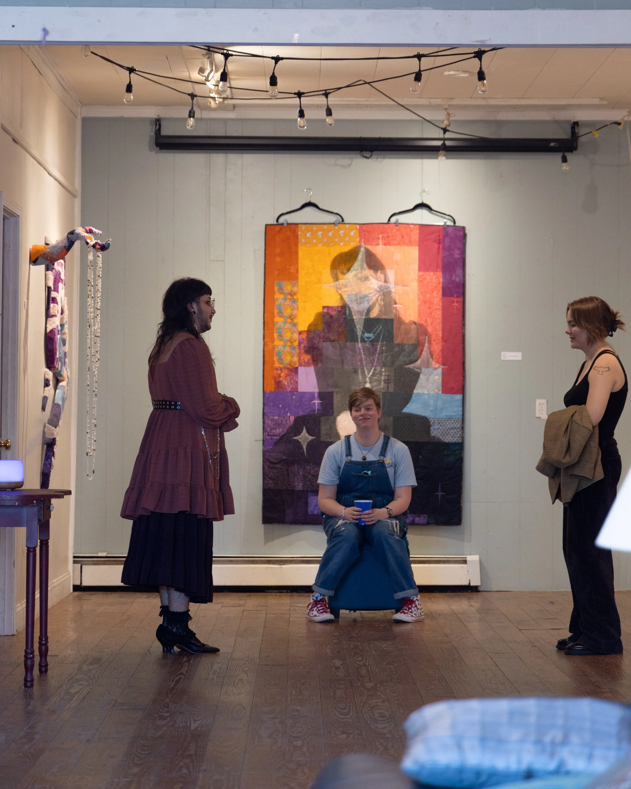 The goal of this exhibition, held in October 2025, was to strengthen the ties of the queer community of the Boone area through art, conversation, and the concept of building your own safety as a collective. This exhibition displayed 15 mixed media works in varying shapes and sizes, with patchworked fabric and painting on their surface. The work makes connections between queerness and craft, secrecy and radicality, safety and political unrest.